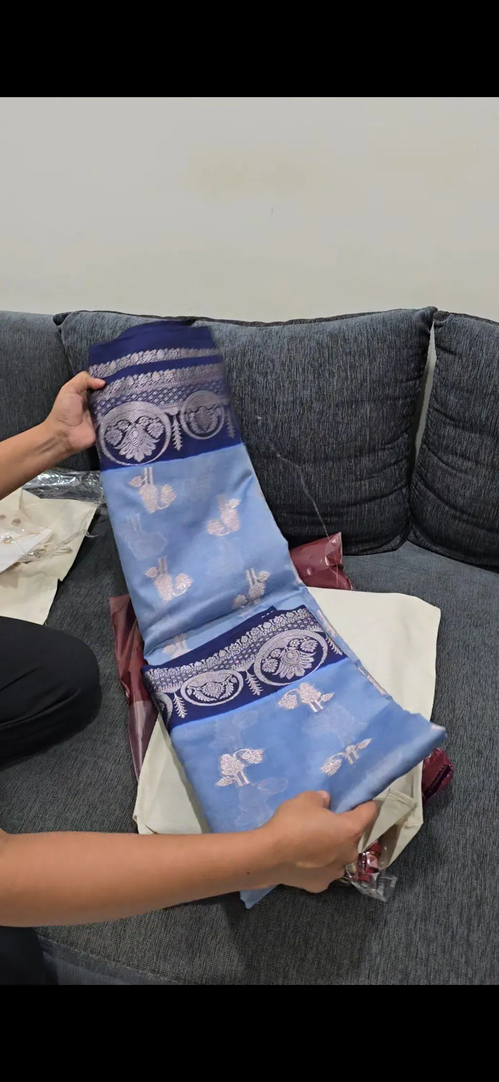 A dreamy Banarasi georgette saree in a cool blue shade, finished with a rich navy blue border and delicate silver zari work. Lightweight, soft, and easy to drape — this saree is perfect for any festive or semi-formal occasion where you want to look elegant without feeling heavy.