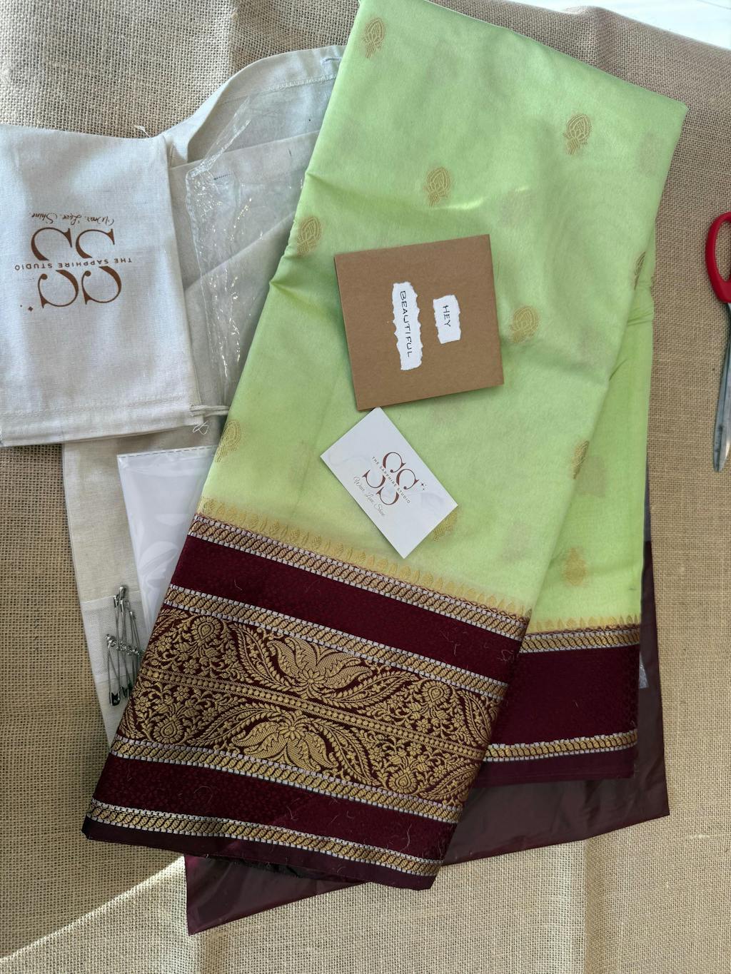 A graceful Banarasi georgette saree in a refreshing lime green hue, complemented by a rich maroon satin border. The saree’s soft, flowy texture drapes beautifully, adding a hint of shimmer with every movement. Paired with a contrast maroon jacquard blouse, this piece is perfect for festive occasions, celebrations, and elegant evenings.