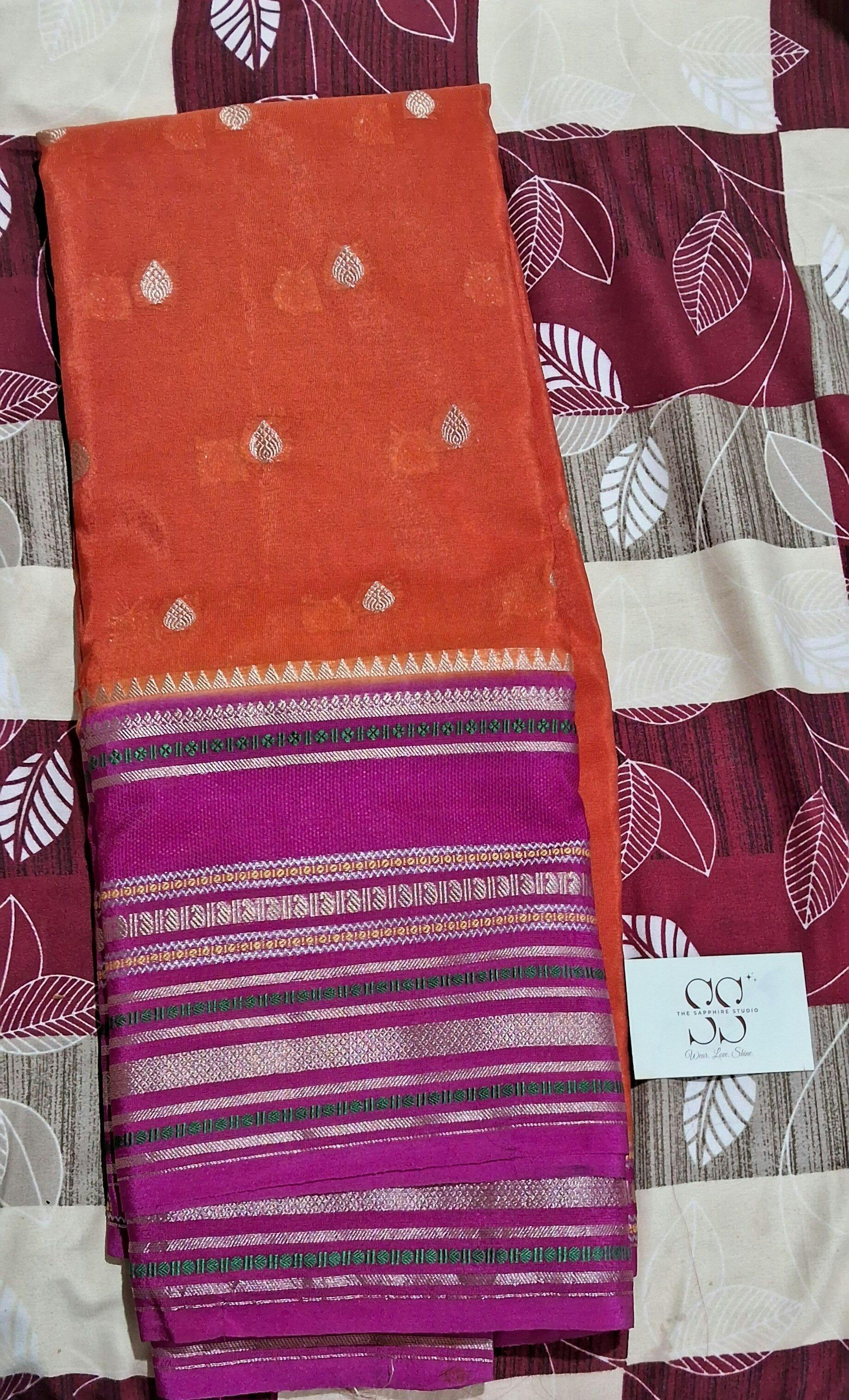 This elegant Banarasi Chiniya silk saree comes in a beautiful orange body with a striking pink zari border — a vibrant and graceful combination perfect for festive wear, poojas, weddings, or celebrations. Lightweight and soft, it drapes effortlessly, blending traditional Banarasi craftsmanship with modern elegance.
